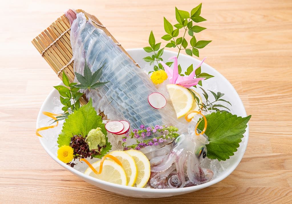天草から直送された新鮮な魚介を使用した寿司をお楽しみいただけます。特におすすめは「天草産マグロ巻き」。寿司だけでなく、いけすから捌いたお造りや焼き物、揚げ物など、多彩な調理法で天草の海の幸をご堪能いただけます。