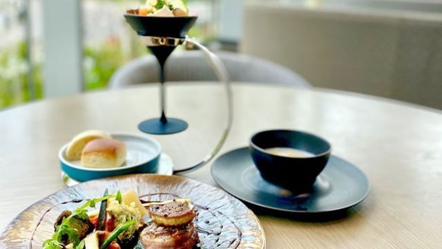 天井までのガラス窓が配置された店内は、明るくて広々とした空間。カフェタイムには外の景色を眺めながら、コーヒーや紅茶などのドリンクメニューをお楽しみいただけます。ランチタイムには、焼き立てパンがおかわり自由となるメニューをご用意。ホテルで経験を積んだシェフが焼き上げる手作りパンを満足するまでご堪能ください。ディナータイムはコース料理を味わいながら、優雅なお食事をお楽しみください。