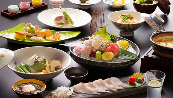「鳴門の渦潮」で知られる鳴門海峡を眺められる、海沿いのレストラン。近海で獲れた新鮮な鳴門鯛はお造りや鯛飯で、ここでしか味わえない身の引き締まりと脂の程よい乗りを堪能していただけます。また、全国有数の漁獲量を誇る徳島県産の伊勢海老は、身の甘みと締まりに定評があり、プリプリとした歯ごたえで噛むほどに甘味が広がります。伊勢海老は、お造りや蓋物としてお楽しみください。淡路牛・阿波牛など、高品質な和牛の料理も合わせて用意しております。