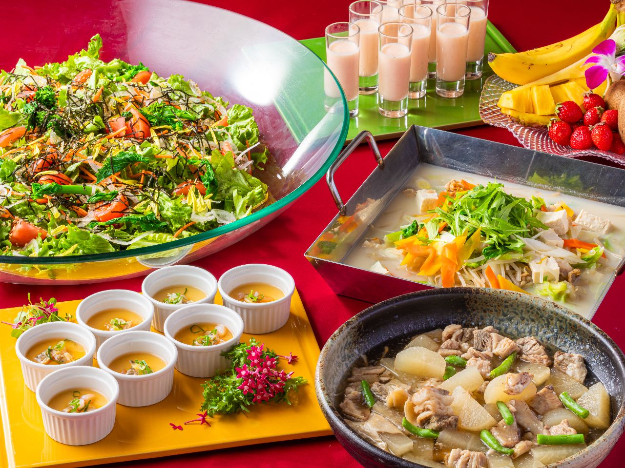 ブランチは当店でしか味わえないご当地メニューから、本格的な和・洋・中が楽しめるビュッフェ約40種類ご用意! ディナーではシェフ自慢の目の前で焼き上げるステーキから、 季節のフェアや麺・飯類、デザートまで贅沢に堪能できます。 お一人様はもちろんのことグループ様も大歓迎。 開放的でスタイリッシュな空間で優雅なひと時を!
