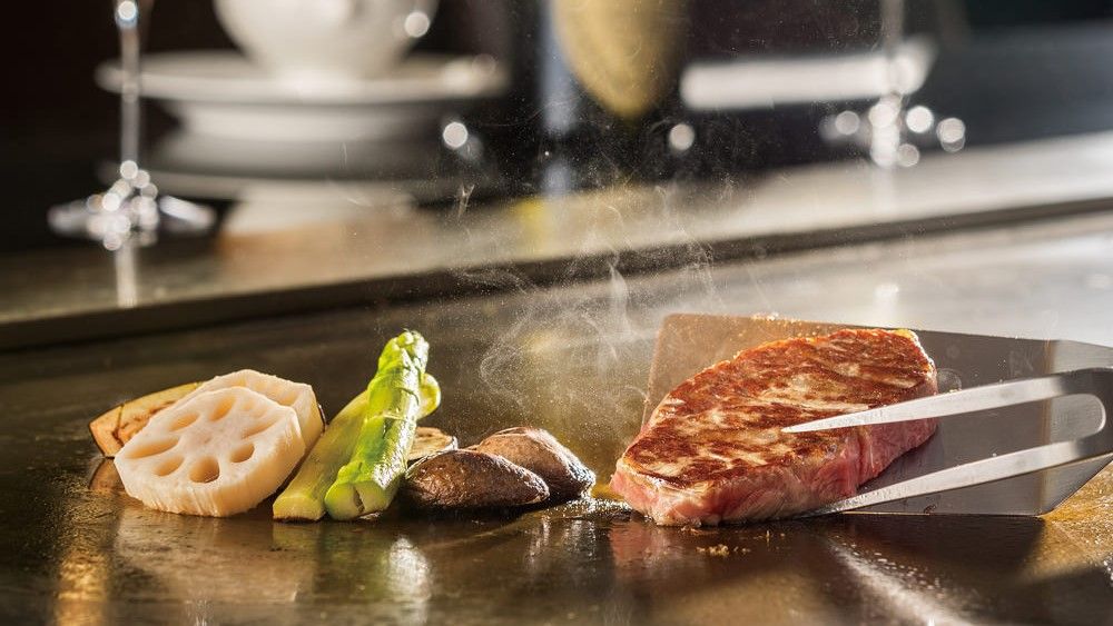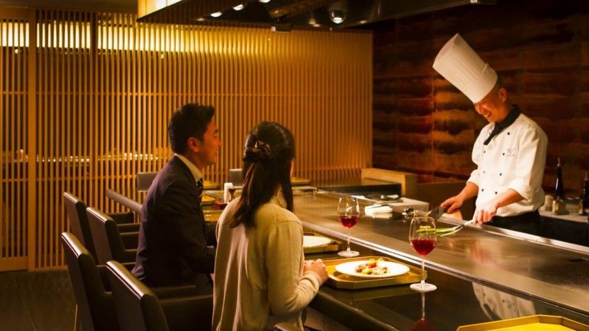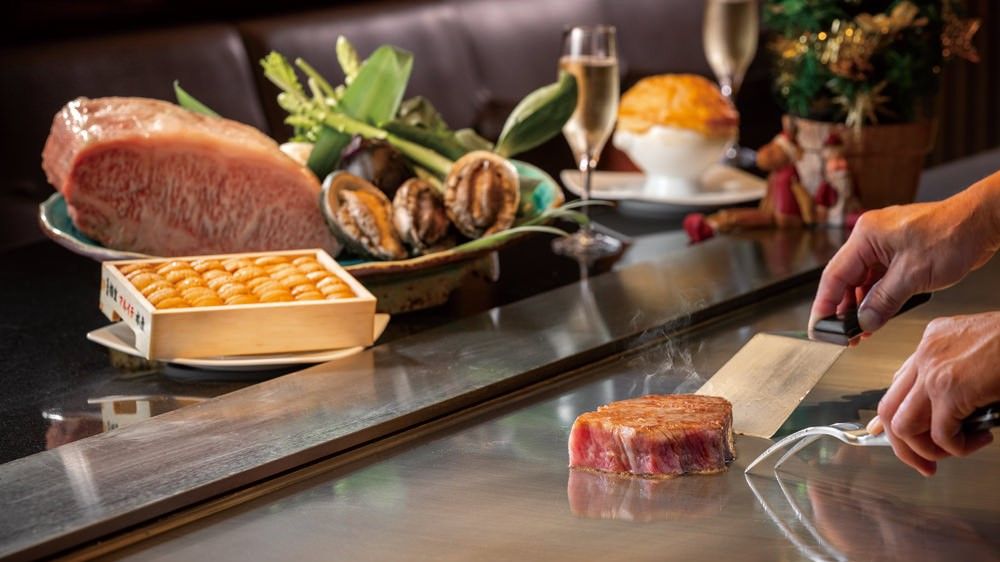 黒を基調とし落ち着いた雰囲気の店内には、デートや大切な人のおもてなしなど、特別な食事の席にぴったりなカウンター席があります。カウンター席ではシェフが目の前で調理を行ったのち、高級和牛や魚介類など旬の食材を使った料理を提供しています。洗練されたパフォーマンスとともに、厳選されたA5ランク牛や人気メニューのガーリックライスなど、上質な鉄板焼きメニューをお楽しみください。
