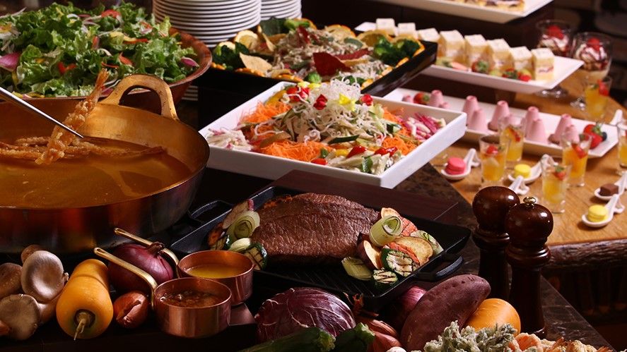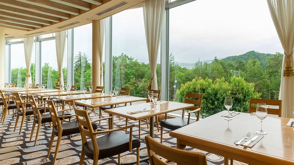 ゆったりとした明るい店内は一面ガラス張りとなっており、朝は雄大な北アルプスの山々を眺めながら、夜には満点の星々と共に、思い思いにお好きな物をバイキングスタイルでお召し上がりいただけます。当店では「地産地消」をキーコンセプトに、飛騨高山の食材を活かした多彩なメニューをご用意しています。また、ディナータイムにはシェフが目の前で提供するお料理やパティシエ特製のデザートもお楽しみいただけます。