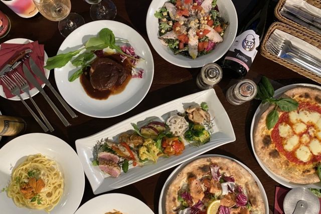 ・前菜盛り合せ ・パン ・季節のパスタ ・メイン料理 (カジキマグロ or 牛ネック+500円) ・デザート ・セットドリンク