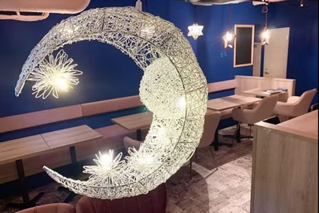 推し活を最大限に楽しめる、星と月をモチーフにした内装のカフェです。数百通りのカスタムパフェや星座をイメージしたドリンク、手作りアイシングクッキーは、色とりどりのビジュアルで訪れる人々を迎えます。推しがいない方も、ゆったりとしたひとときをお楽しみいただけます。