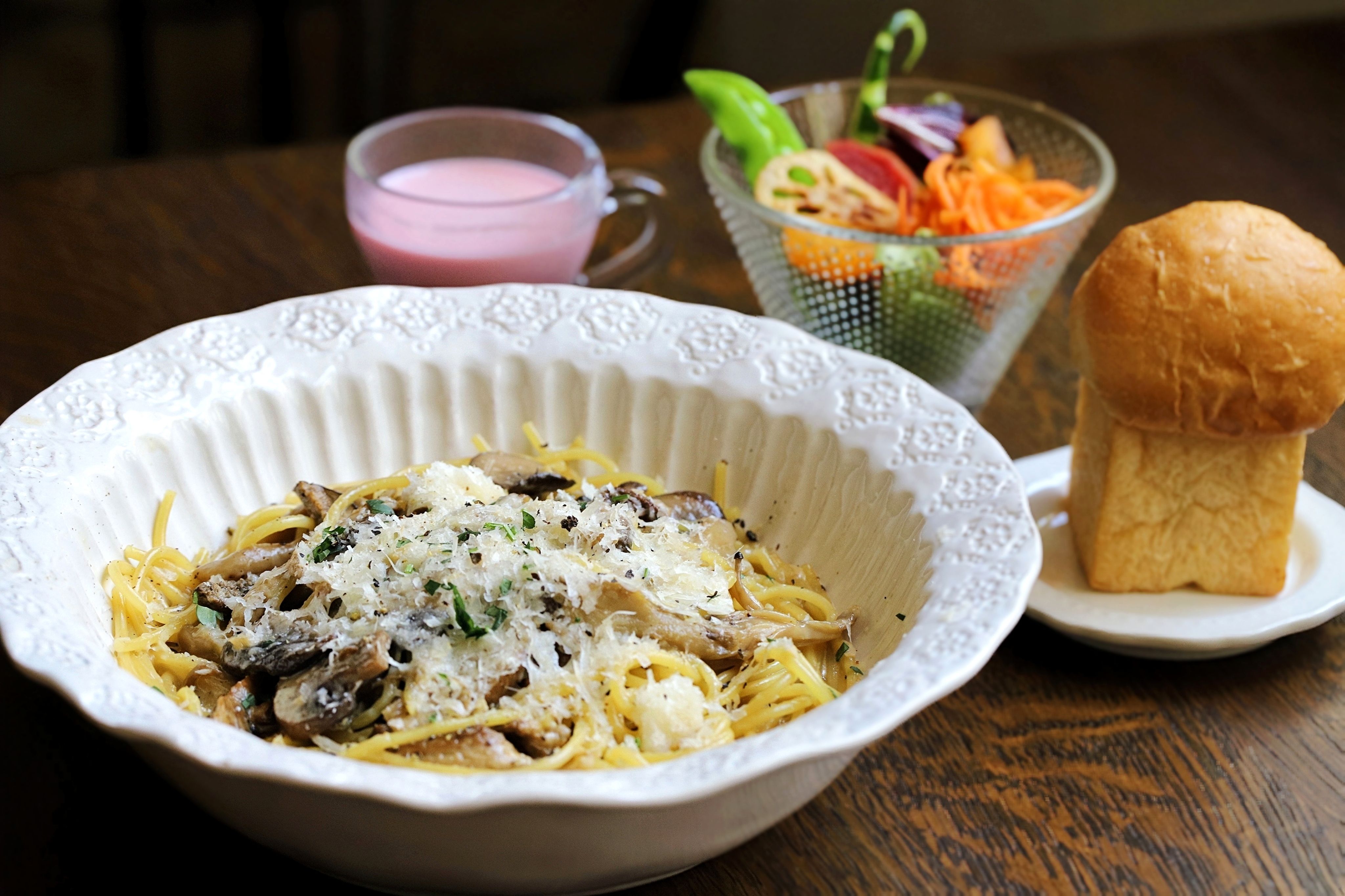 店内に足を踏み入れると、そこは都会の喧騒から離れた英国の田舎町。アンティークな小物が飾られた店内は、木の温もりが感じられる穏やかで静かな空間です。四季折々で移り変わるイングリッシュガーデンを眺めながら、こだわりのドリンクやお料理、季節に合わせたスイーツや限定パフェをお楽しみください。