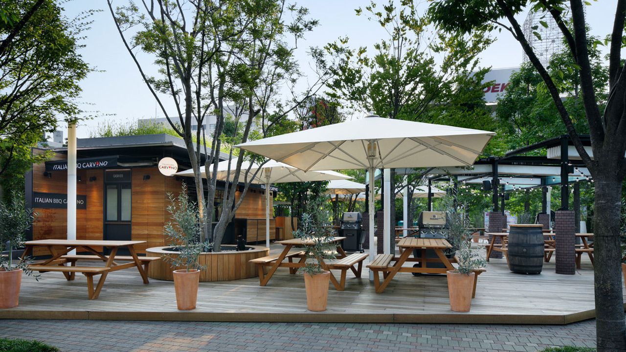 東京にいながら自然を感じられる緑を多用した空間となっており、ウッドデッキと白いテントがナチュラルで開放感あふれるインテリアでBBQを満喫できるつくりになっています。 機器類も食材もセットになっており、手軽にいつでもBBQをお楽しみいただけます。 豪快な塊肉を使ったBBQのほかにも、山形産の国産豚をはじめ、バラエティに富んだメニューを用意しております。 また、隣接のレストランでは各国のワインを多数ご用意しておりますのでセレクトも承ります。