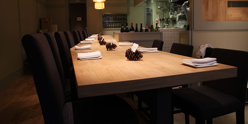 食べていただく方それぞれに、旬の食材でおいしく温かい料理を作りたい。そのような想いのもとに設えた店内は、木々の温もりや優しい色合いを生かした、居心地良く食事を楽しめる空間となっています。メニューについてはランチとディナー共に、シェフが「おまかせ」でご用意。季節に合わせた食材を中心に、シェフ自らが厳選した魚介や野菜、果物などを数多く使用して調理いたします。さらに、ワインもさまざまな種類のものを常時取り揃えているため、食事との組み合わせは最適なものとなるでしょう。