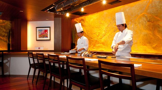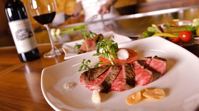店内に入ると、壁には山肌がデザインされ間接証明の優しい光に包まれた非日常的な空間が広がります。カウンター席とテーブル席があり、メニューはコース料理が中心です。鉄板焼きに使われるのは最上級ランクの黒毛和牛を始め北海道産のホタテなどの魚介類、契約農家より届く四季折々の野菜です。熟練のシェフが最高の焼き具合で提供します。ドリンクはビールやワイン、カクテル、ブランデーなどをご用意しております。最高の鉄板焼き料理と共にお楽しみください。
