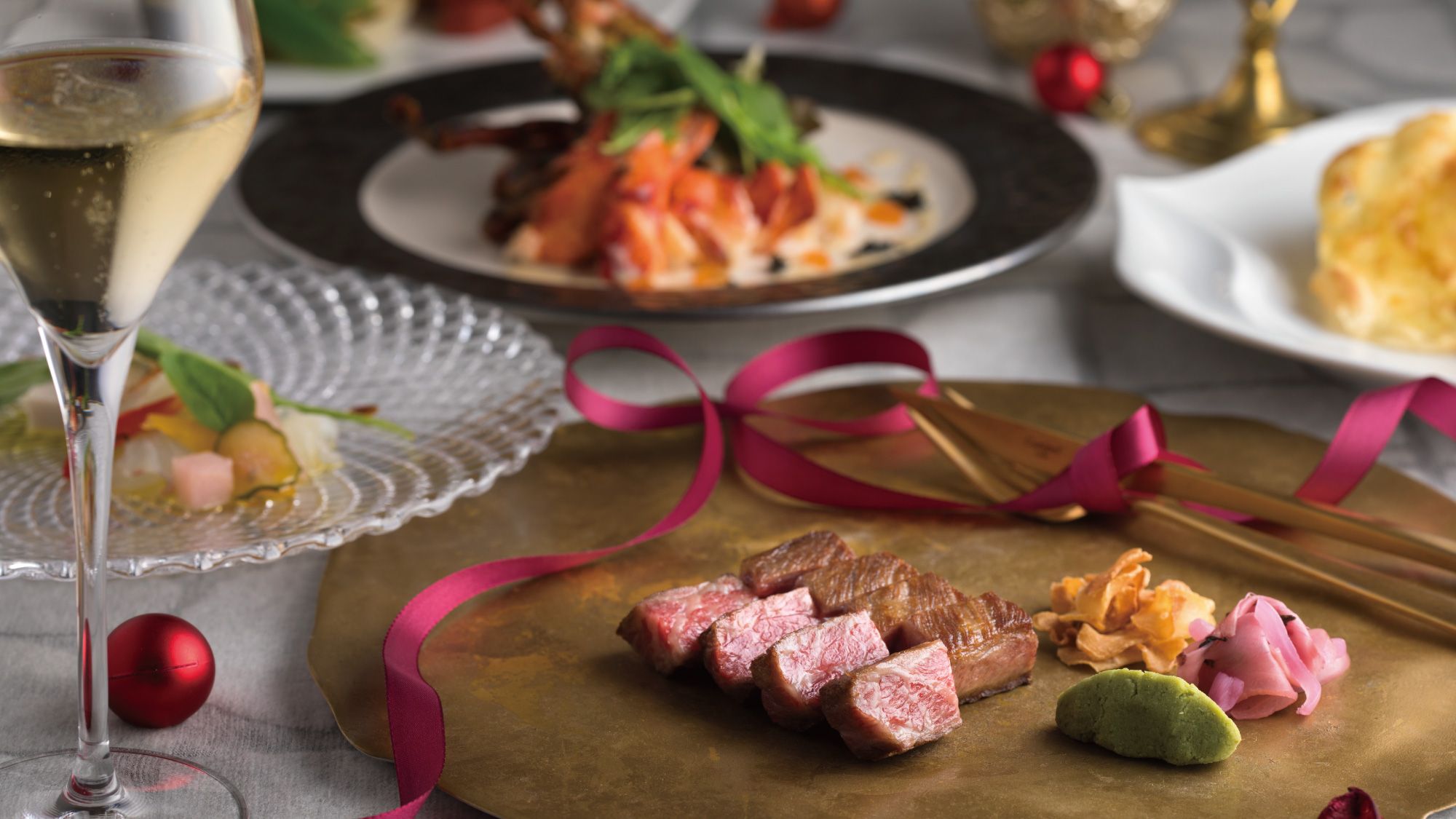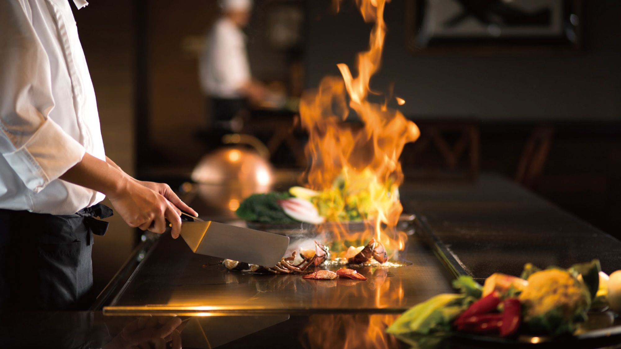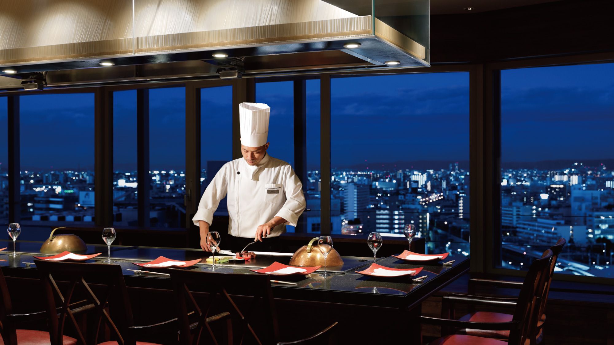 新大阪駅から徒歩1分。ホテル最上階から大阪の夜景が見渡せる「鉄板焼き 一花一葉」は、琥珀色が特徴的な、高級感あふれるカウンター席が大人の空間を演出する鉄板焼きレストランです。素材そのもののおいしさをシンプルに提供したいという思いを店名に込めた「一花一葉」では、シェフが選び抜いた上質な黒毛和牛を4種類の塩と本山葵などで味わうほか、四季の食材で創るお料理を職人の妙技とともにご堪能いただけます。