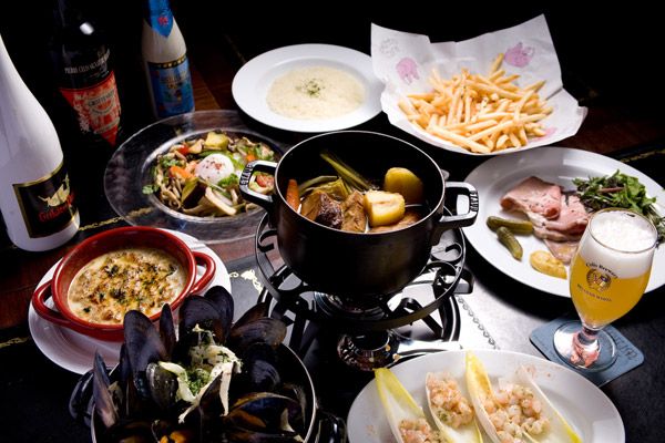 ディナーメニューは牛肉やムール貝料理、オードブル、サラダ、パテやテリーヌなどの豚肉料理、魚料理、チーズ盛り合わせ、パスタ、スナック、デザート各種、カフェがあります。黒毛和牛門崎熟成肉やイベリコ豚をメインに選べるコースは、ベルギー直輸入のビール生樽最大15種とワイン10種とほか多数の飲み放題プランがプラス!約100種類以上ある生樽のベルギービールのうち、常時14種類を提供。毎週月曜日に週替わりするビールをお愉しみください。