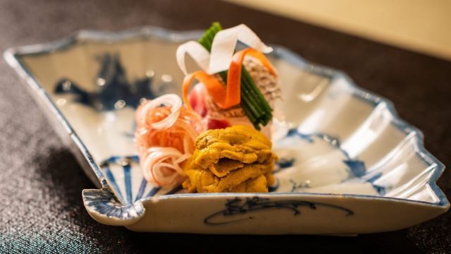 瀬戸内の潮流が育む魚介類、大自然が生む野菜やジビエ、豊かな川で取れる川魚。愛媛県はそうした魅力的な食材の宝庫であり、その豊かで調和のとれた食材を活かした「食」を提供するのが、道後「海船」です。落ち着きのある店構えから、和の設えが美しい店内へお客様を誘い、瀬戸内の素晴らしい旬の食材を堪能して頂きます。カウンター席の他、個室もあり、テーブル席や掘りごたつの部屋など、用途や人数に応じて柔軟に対応致します。