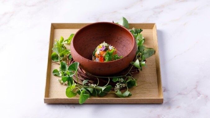 選び抜かれた漁港の魚と農家直送の野菜、里山の山野草を中心に季節感溢れるメニュー構成で シェフと身近に話せるカウンターを中心とした劇場型レストラン薪窯の香り食材の奏でる音もお楽しみください