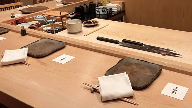 銀座ソニー通りに面した店内に一歩足を踏み入れるとそこには都会の喧騒を離れた別世界が広がります。全7席の凛とした店内は、清潔感溢れる白木のカウンターと隅々まで気を配った調度品を配した極上の空間です。 趣向を凝らしたつまみから品のある握りへと続く”おまかせ”は四季折々のネタを、あるものは鮮度にこだわり、あるものは江戸前の技法を駆使して最高の旨味を引き出しご提供しています。