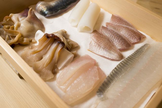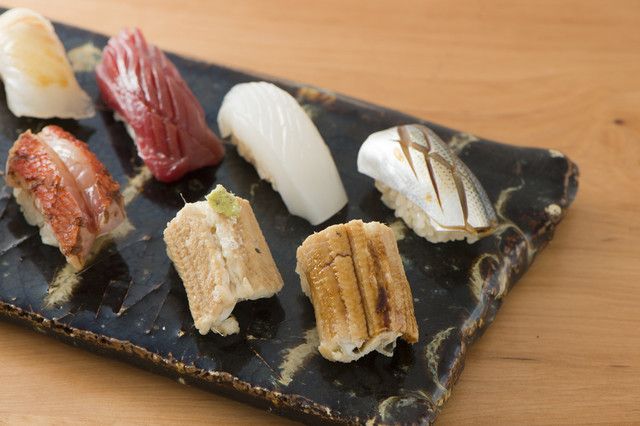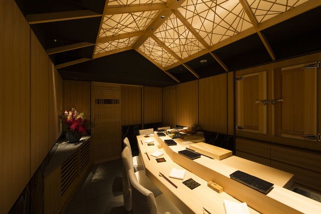銀座の隠れ家的佇まい、店内は和様式美に拘った豊かな時間が流れるくつろぎの空間。食材はすべてこだわり抜いた天然素材です。毎朝市場から仕入れる旬の魚、風味豊かな海苔、オリジナルの甘酢で漬けたガリ、醤油も料理に合うものを数種類用意しています。カウンター越しに眺める職人の研ぎ澄まされた技、陶芸作家による個性あふれる器、美しく仕上げられた料理の数々。大小個室もご用意しておりますので、大切な方とのひとときをご堪能ください。