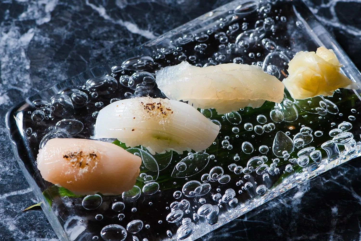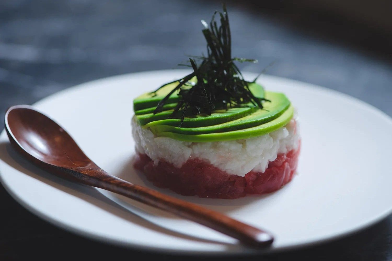 ・本鮪尽くし/Blue Fin Tuna 大トロ/Premium Blue fin tuna belly 中とろ/ Blue fin tuna belly 赤身/Blue fin tuna 漬け/Soy sauce marinated Blue fin tuna マグロのミルフィーユ/ Mille-feuille Blue fin tuna