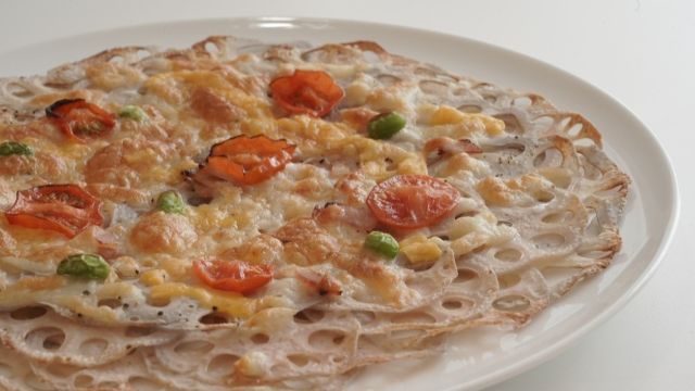 国産蓮根を敷き詰めたサクサクの生地。蓮根の食感とチーズの香ばしさがやみつきになる美味しさ。お腹いっぱい食べても蓮根だから罪悪感はありません!