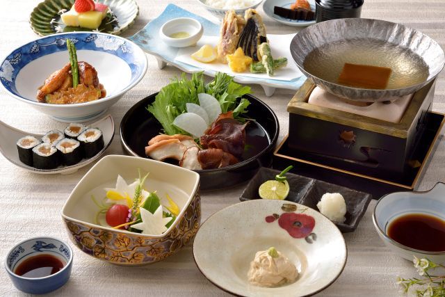 店内へ足を踏み入れると、木を基調とした落ち着いた雰囲気のある空間が広がっています。日本庭園を眺めながら、大切な方と一緒にゆったりとした心安らぐ時間をお過ごしください。カウンター席では、目の前の鉄板で食材が焼き上げられていく様子をお楽しみいただけます。当店で用意しているのは、旬の食材を用いた日本料理です。シェフによる調理で、最大限に引き出された素材の旨味をご堪能ください。
