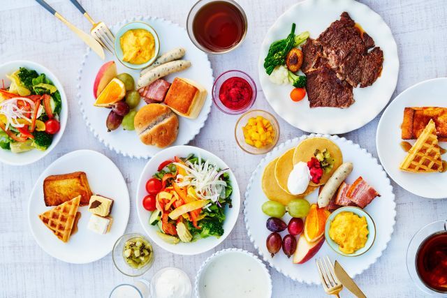 レンガを基調としたNYスタイルの店内は、広々とした空間が広がるワンランク上の洗練された雰囲気です。テラス席からはリバービューも楽しめます。一直線に続くカウンターには、旬野菜のポタージュや魚、肉料理など色とりどりの多国籍料理を豊富にご用意しています。サラダバーではキヌアやチアシードなどのスーパーフードも取り揃えています。ディナータイムには、串揚げやビーフサーロインステーキなどのメニューをシェフが目の前で仕上げる、ライブメニューのパフォーマンスもお楽しみいただけます。