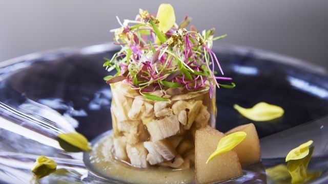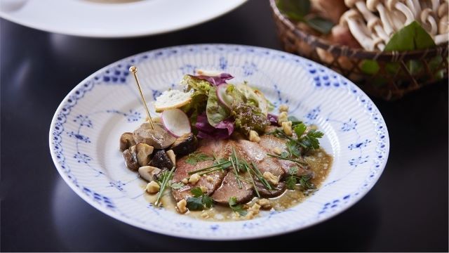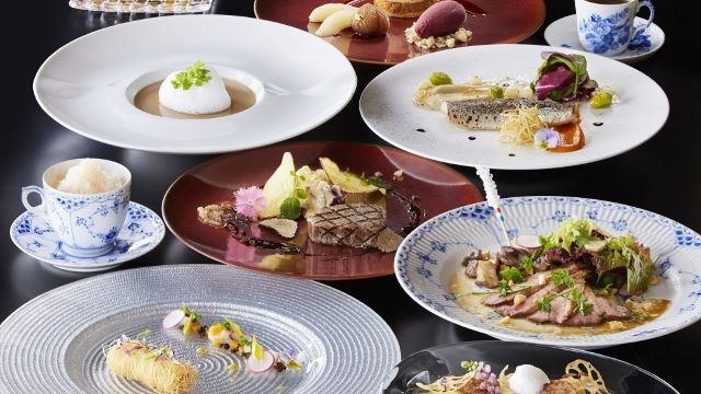 ヘリンボーンのフロアに置かれたテーブルには、輝くシルバーカトラリーとワイングラスのセッティング・・・。デ アドミラルは、重厚感あるインテリアの本格的フレンチレストランです。旬の素材の特徴を最大限に生かした料理をご提供します。
