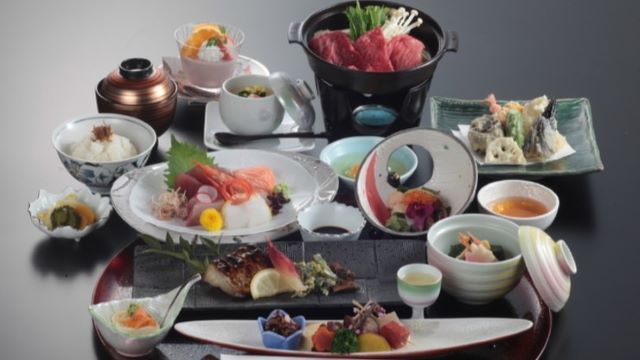 地産地消にこだわって地元・鳥取産の食材をふんだんに使い、鳥取の四季を料理で表現している和食店です。県のブランド牛・東伯牛や期間限定のカニなど、鳥取ならではの美味を心ゆくまでご堪能いただけます。食器はすべて有田焼を使用し、料理をより美しく見せるよう工夫しております。店内は県内産のスギやヒノキを多用した落ち着いた空間。窓から見える庭園には佐治石を用い、遠く日本海を望むこともでき、非日常のひとときを楽しんでいただくことができます。