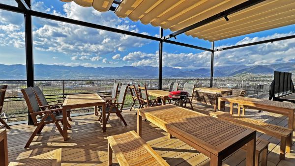 甲府盆地や南アルプスを一望できるカフェです。春から秋にかけては、オープンエアーのテラス席でバーベキューをお楽しみいただけます。店内では、ビールやワインに合うお食事やスイーツ、ジェラートをご用意しています。隣接する「IWAI BREWERY」では、こだわりのクラフトビールもお楽しみいただけます。ペット同伴も可能なため、大切な家族と一緒にお過ごしいただけます。
