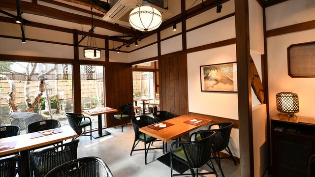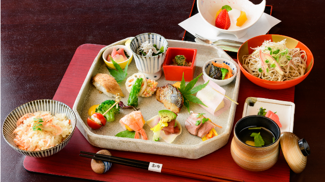 観光スポットから程なく、店内は和やかで落ち着いた雰囲気漂う空間です。四季折々の景色を愉しめるテーブル席と個室を用意しており大切な方との一時を特別なものにします。開放的なテラス席では季節の風を肌で感じることができます。料理は旬の食材を技法にこだわって調理した日本料理が中心です。国産蕎麦粉で打った風味豊かな十割蕎麦やすき焼き、しゃぶしゃぶなどもご用意していますので、人数や用途に合わせてお気軽にご利用ください。