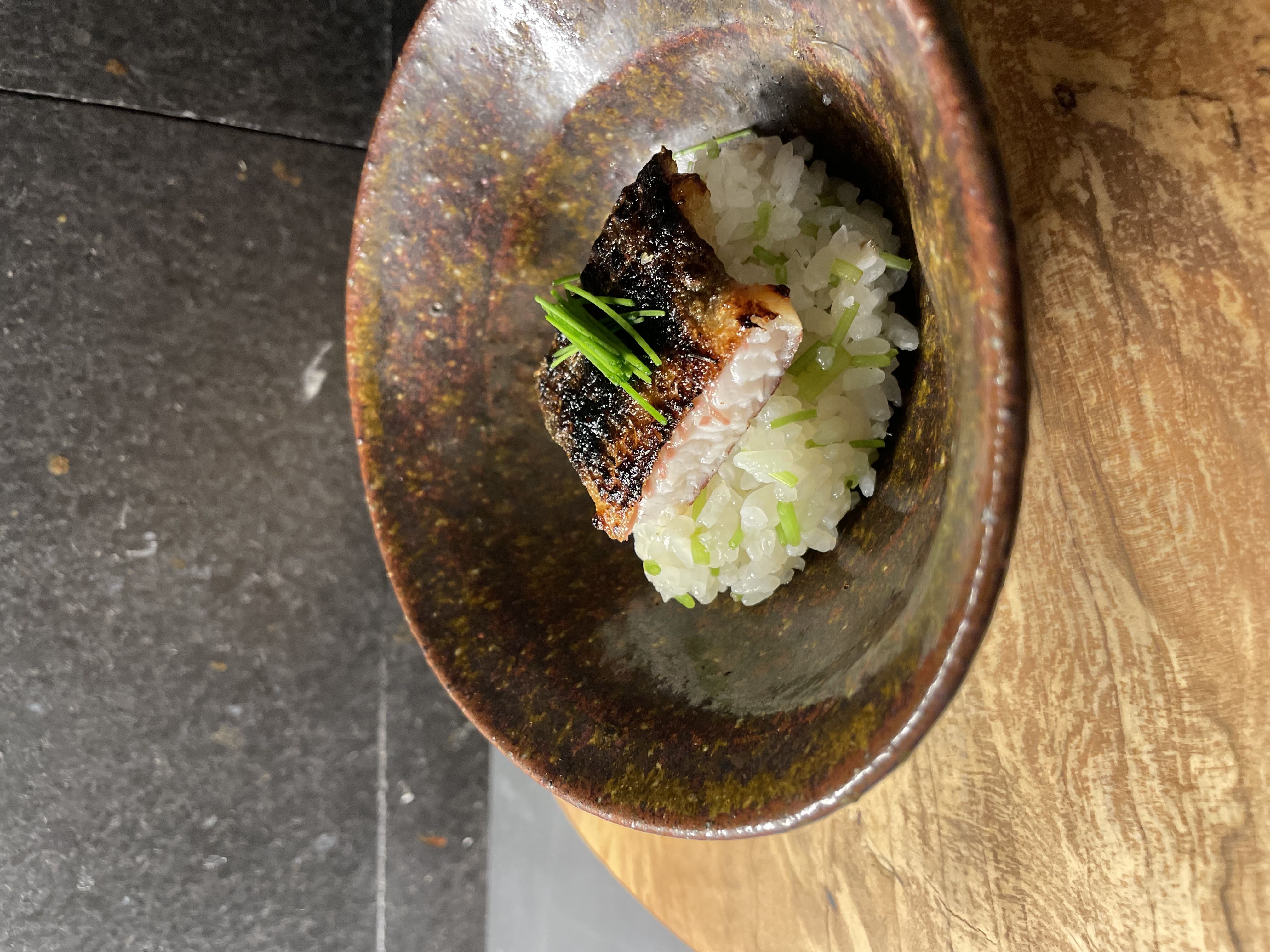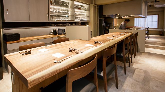 店内は薪火を中心に2つのカウンターがあり一枚板のカウンターはサービスマンを目の前に落ち着いた雰囲気、和紙のカウンターはキッチンの前なので料理を作る姿を楽しんで頂けます。 料理はイタリアンをベースに和を取り込んでいます。 薪火の可能性を是非ご来店いただき体感してください。