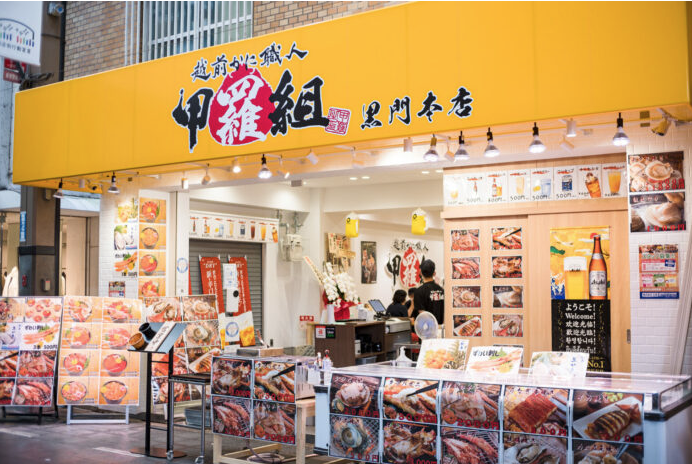 大阪・黒門市場にある「甲羅組築地本店」。人気の新鮮なカニや海鮮を店頭販売するほか、店内では焼きガニや海鮮焼き、貝類、海鮮丼も楽しめます。お酒との相性も抜群で、カニ専門店ならではの贅沢な味わいを堪能できます。