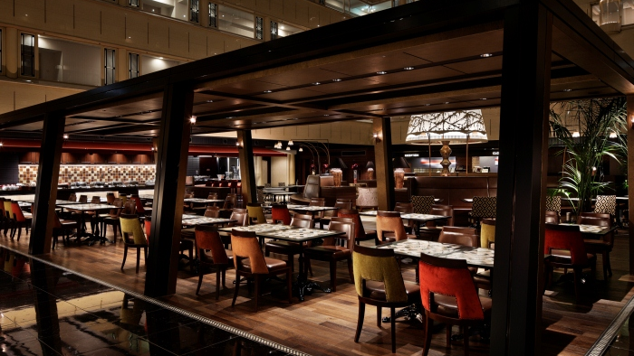 「オールデイダイニング ラジョウ」では、 オープンキッチンのライブ感を楽しみながら、出来たての美味しい料理をお楽しみいただけます。フレンチの技法をベースに、各国料理を現代風にアレンジした多様な料理をお召し上がりいただけます。6階まで吹き抜けが広がるスタイリッシュで開放的な店内は、数々の空間アワードを受賞。朝昼夜と多彩なメニューを楽しめるビュッフェのオールデイダイニング。ガーデンを臨むパーティールームでは、プライベート空間でお食事を