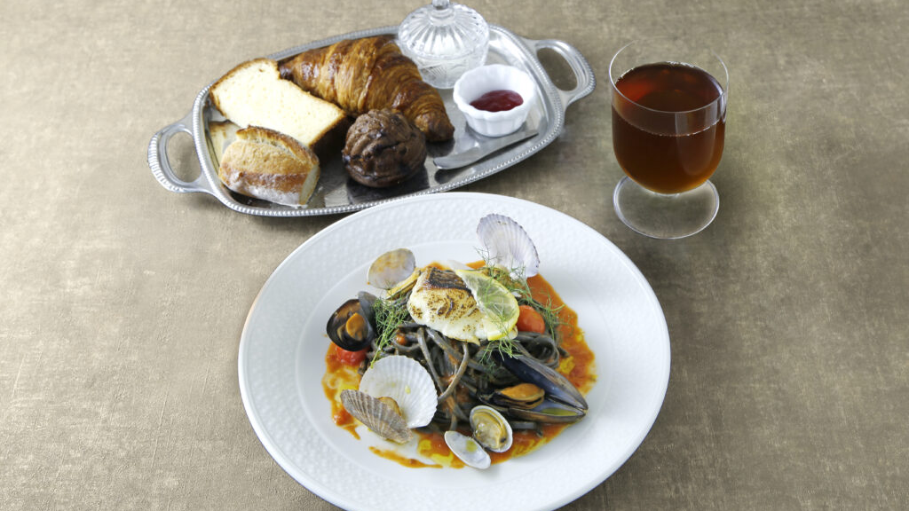 ・鮮魚のポワレと3種の貝のペスカトーレ 甲殻類のソースとハーブ、レモン / イカ墨を練り込んだリングイネ(+600円)