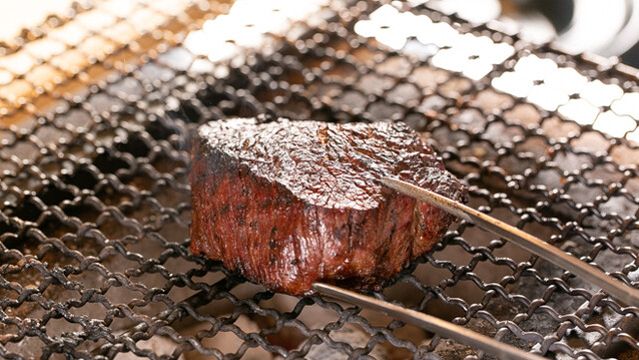主人の岡義隆は、祇園で牛肉を焼く料理人です。 肉焼きの仕事を続けて、20年以上。 黒炭と薪を使い、遠火でゆっくりと火を入れる。 脂が炭に落ち、炎が立ち上がる。 その香りと煤が肉に絡み、香ばしさと奥行きが生まれる。 お客様から「肉焼き師」と呼ばれています。 ブビンガの一枚板、8席のカウンター。 席からは、苔と玉砂利の坪庭が見える。 炭火の音、肉の香り。 目の前で、火が入っていく。 歴史と自然の記憶から生まれた音色が、この空間に静かに重なり、料理は目の前で生まれる。