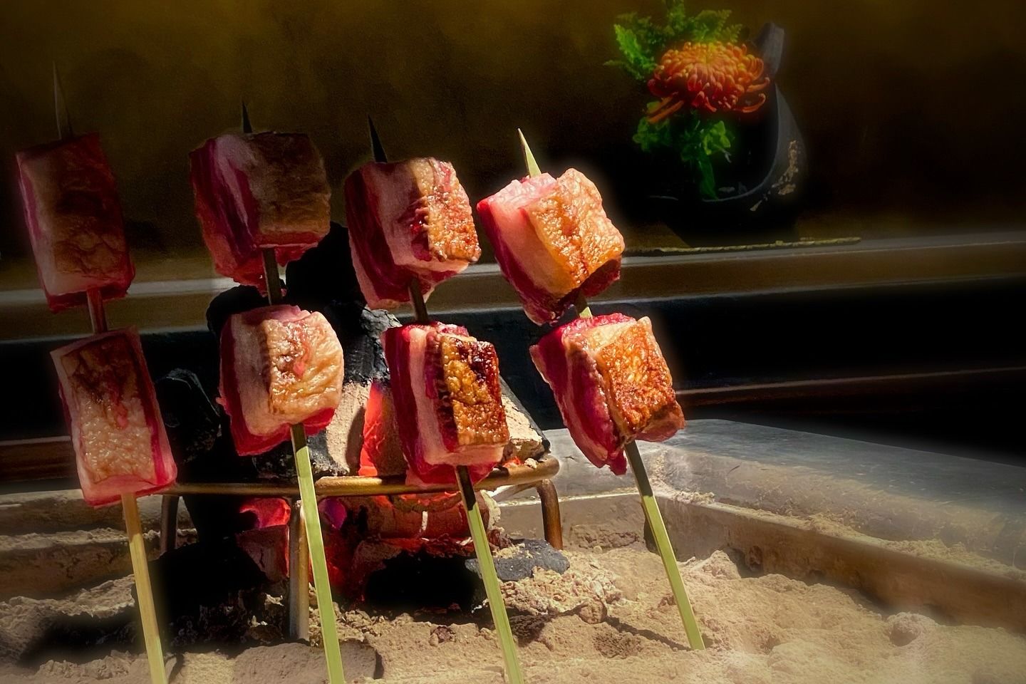 当店では、香川県のオリーブ牛をはじめとした産地直送のブランド和牛を使用し、職人技が光る「純生 牛肉刺し」や「原始よろず焼き」をご提供しております。囲炉裏を囲む落ち着いた空間で、秘伝の割醤油やお出汁と共に和牛の旨味を存分にご堪能ください。大人の隠れ家としてジャズの流れるシックな店内で心温まるひとときをお過ごしくださいませ。