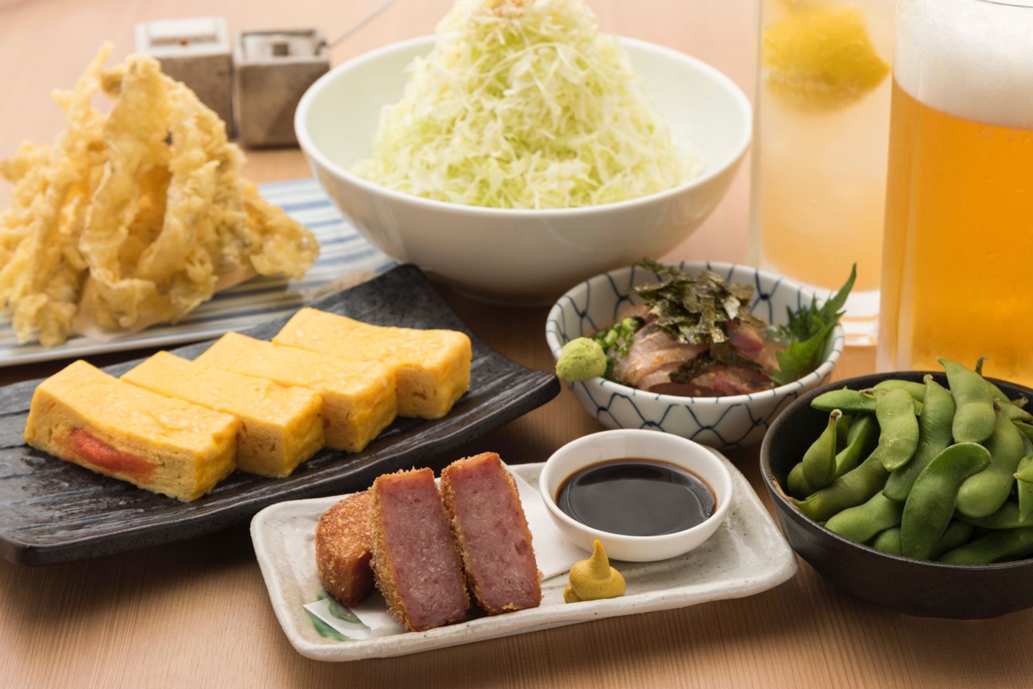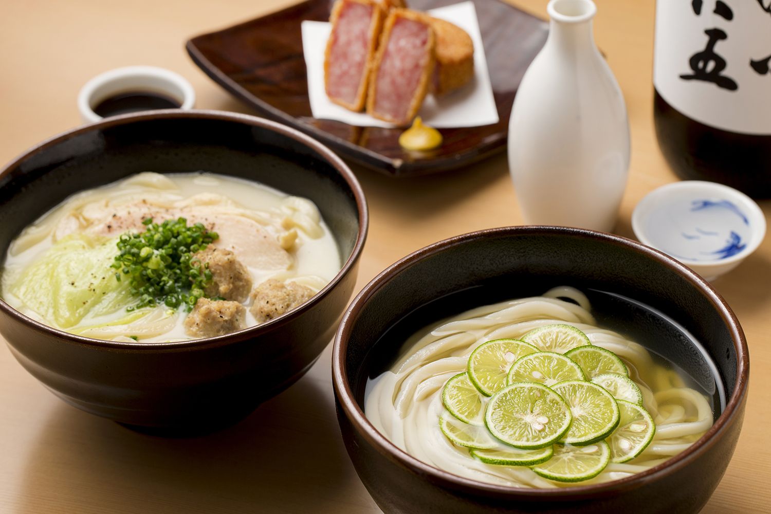 木の温もりがある店内は、カジュアルな雰囲気のテーブル席をご用意しています。人気の手打ちうどんは糸島産の小麦を使用しており、讃岐の心地よいコシと博多の優しい味わいを併せもちます。また、博多名物の煮込み、薄衣の厚切り雲仙ハムカツなど、日本酒やビールにぴったりな約30種類のおつまみもございます。