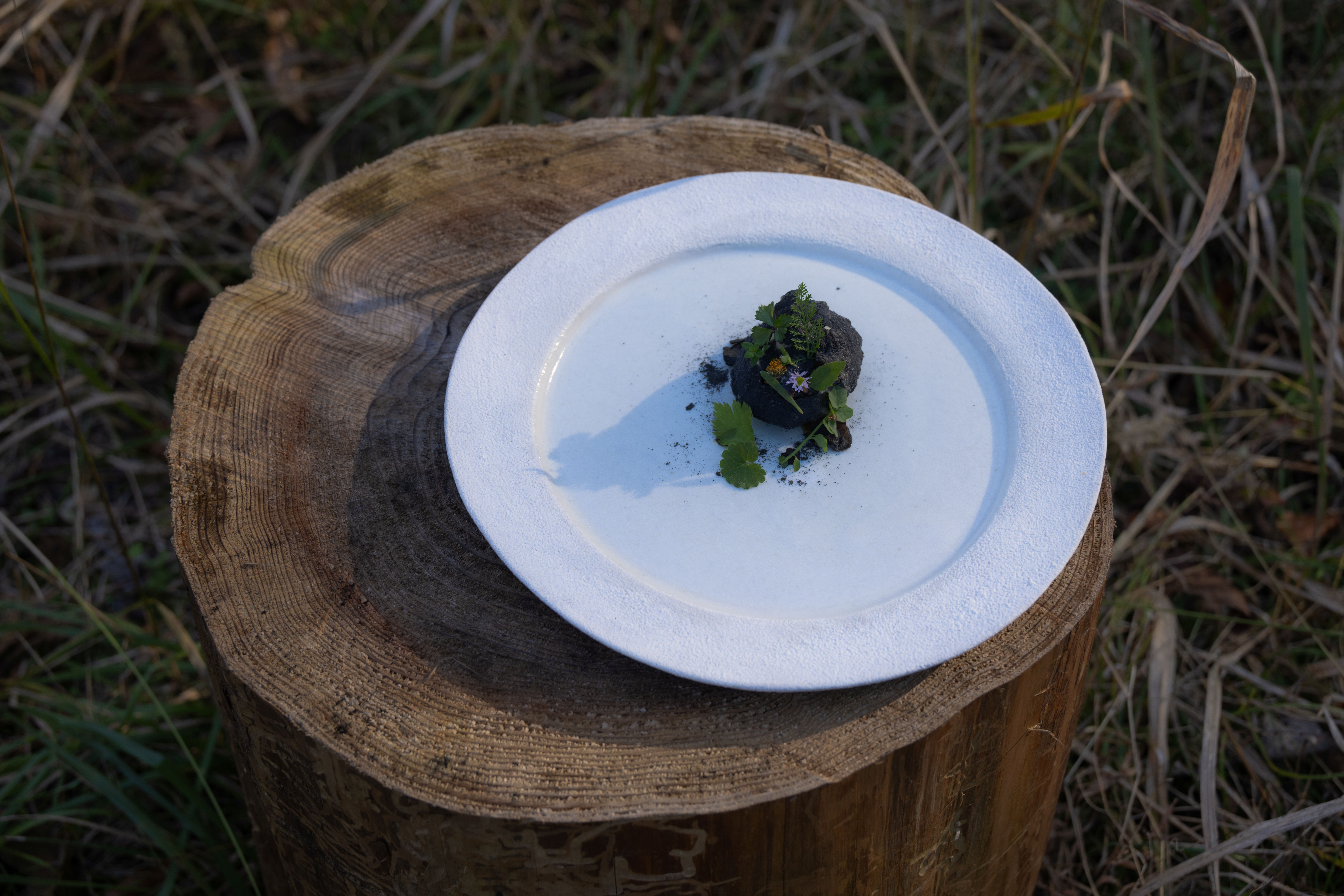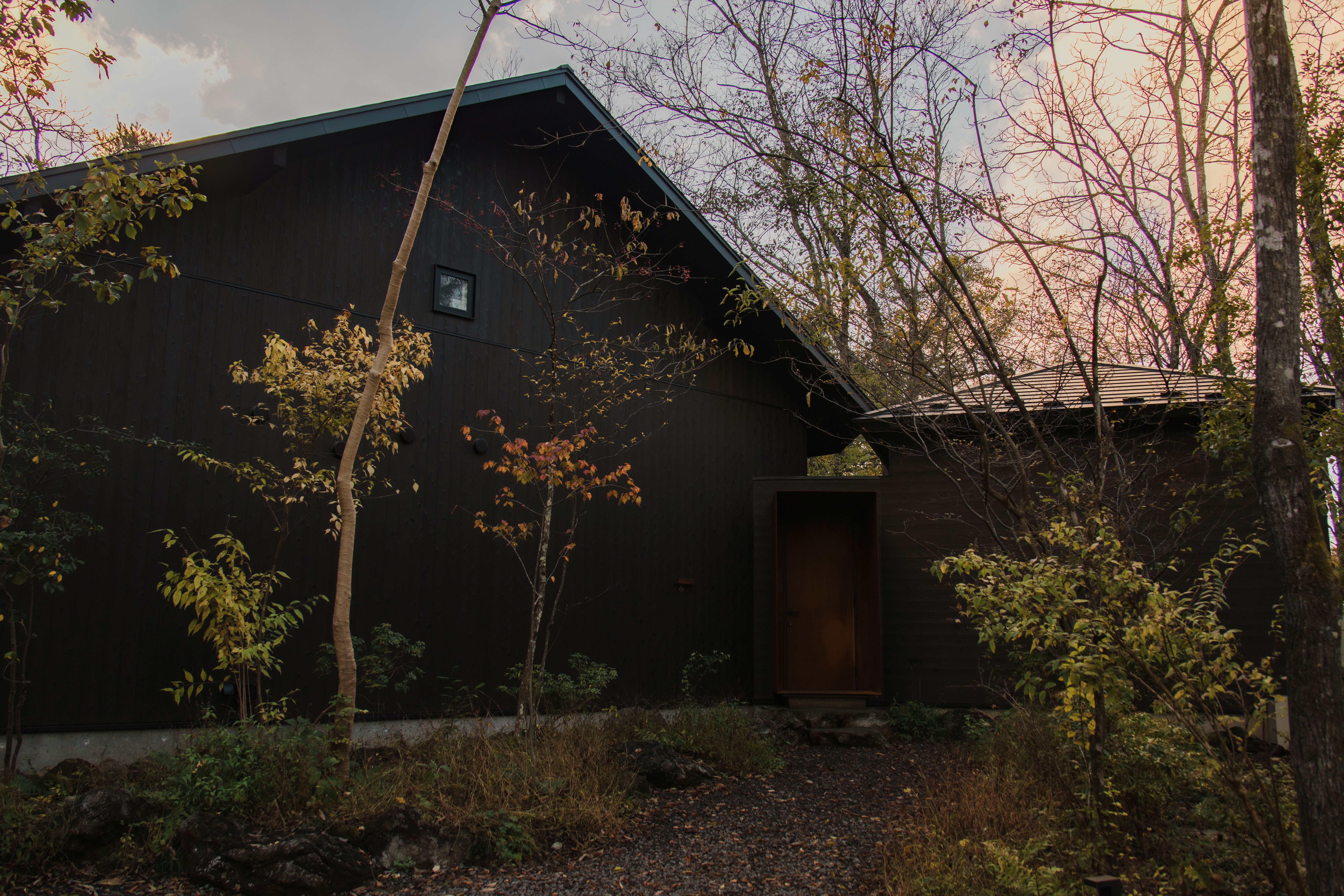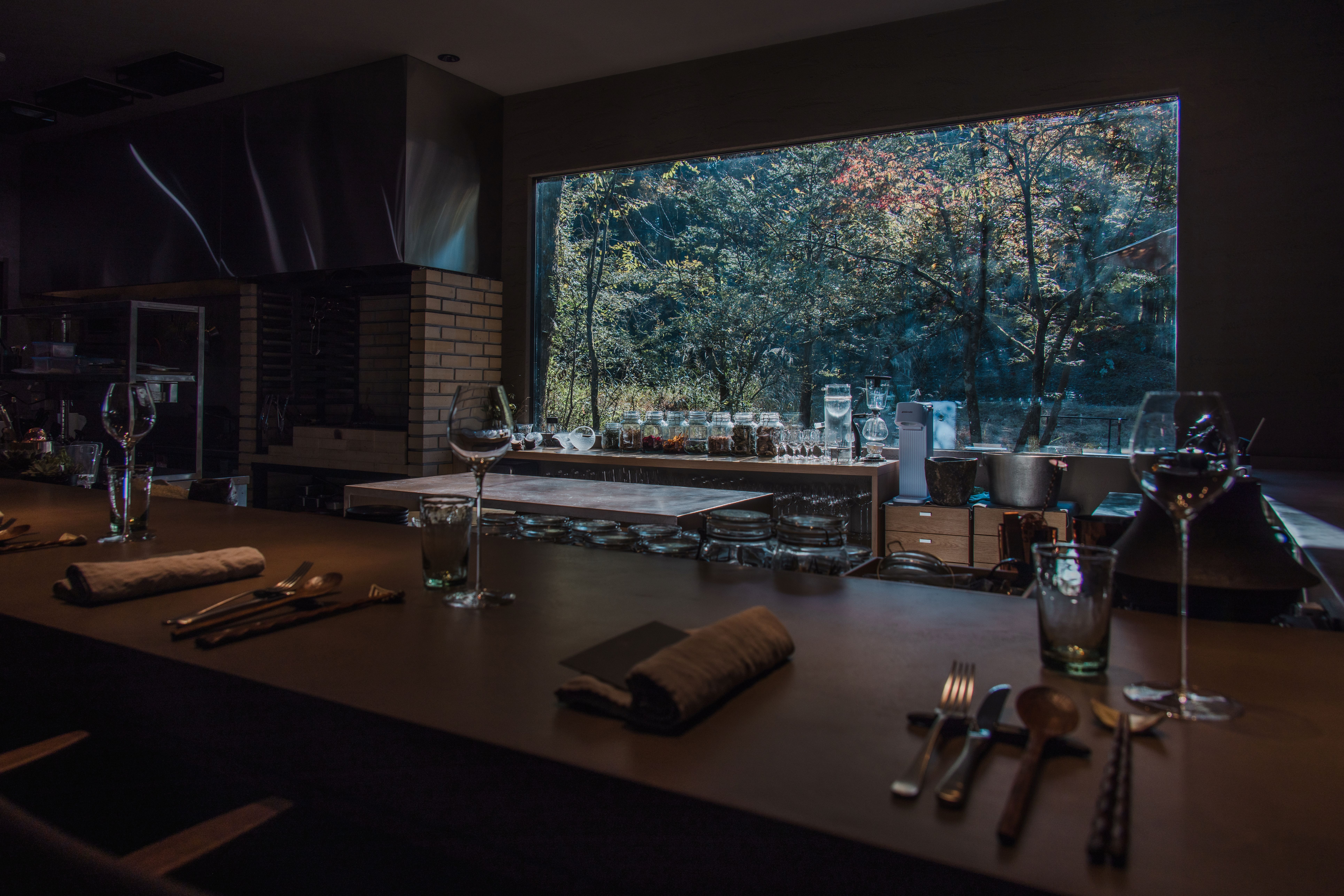 森の中にひっそりと佇むレストラン・オーベルジュ。9席だけのカウンターからは、四季折々の景色がお楽しみいただけます。食事前のドリンクは、木々に囲まれたテラス席で。一室だけの宿泊棟は、スタイリッシュながら、どこか温かさを感じていただけます。
