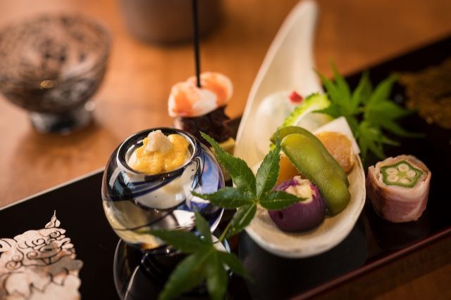 店内に足を踏み入れると、壁一面のガラスの向こういっぱいに広がる空と海、そして山。3つの美しい碧が優しくあなたを出迎えてくれます。 お寿司、会席料理、しゃぶしゃぶの3種類の日本料理からコースを選択することができます。雑味のない上質な肉質が特徴の又吉アグーや沖縄そばなど、沖縄でしか味わえない食材や料理をぜいたくに組み合わせたここでしか食べることができない創作日本料理をお楽しみください。