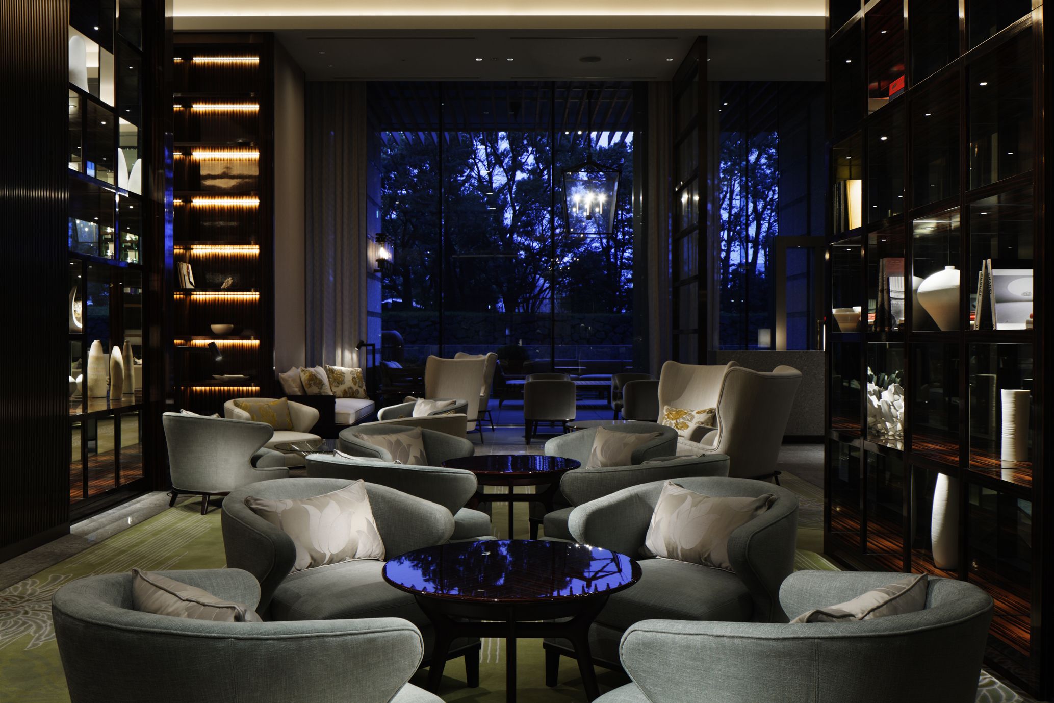 暖炉と本棚が、自宅のリビングのような寛ぎ感を醸し出すロビーラウンジ。窓外には緑やお濠の水が広がり、抜群の癒しの空間が広がっています。輪島塗漆器 "Stones" で提供されるアフタヌーンティーとともに楽しむ世界のお茶や、生演奏に浸りながらのバータイムなど、ホテルならではのエレガントなひとときをご堪能いただけます。