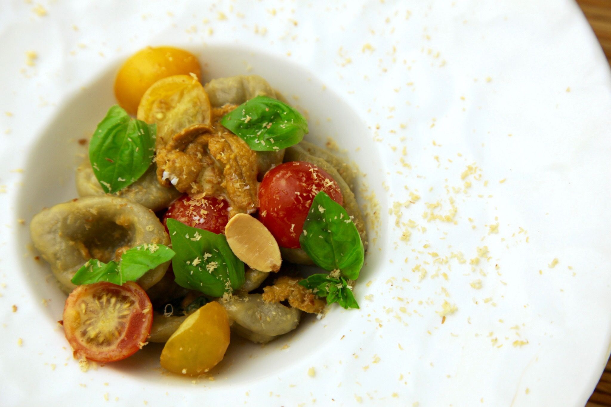 かつてのイタリア王テオドリックのために498年に創設された街”ボスコマレンゴ”から、このエリアの香りの1つマジョラムと松の実のシンプルなハーブソース