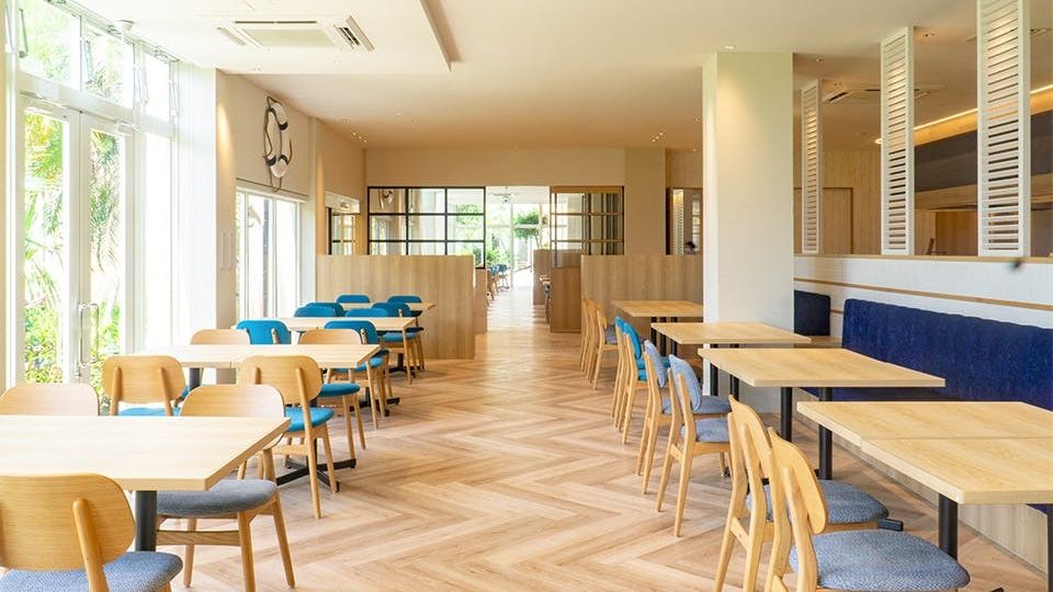 白を基調としたフレッシュな壁に青が印象的なファニチャー、宮古島の美しい海岸をそのまま表したような爽やかな店内が特徴的です。目の前にはエメラルドグリーンにきらめく海。抜群のロケーションで地元産の野菜や魚介をふんだんに使用したブッフェをご堪能いただけます。沖縄の名物料理や南国フルーツたっぷりのスイーツなど宮古島らしさに溢れたメニューを豊富にご用意。朝食・ランチ・カフェ・ディナー、さまざまなシーンにご利用ください。