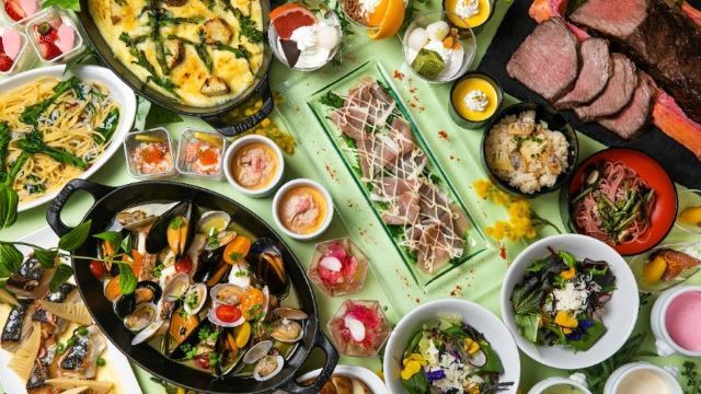 白い壁が映える、モダンテイストの内装となっています。広い空間の中で、自由にブッフェをお楽しみください。洋食を中心に、豊富なメニューをご用意しています。また、旬の食材を積極的に使用しますので、季節ごとに異なるメニューをお楽しみいただけます。