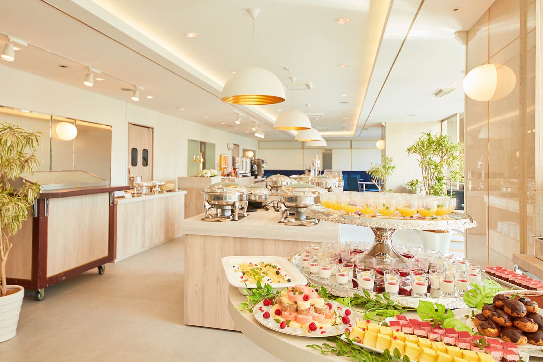 大きなガラス窓から気持ちの良い自然光が降り注ぐレストラン。高い天井の開放感のある空間の中で、和洋中の30種類以上の料理やデザートがバイキング形式で楽しめます。ランチタイムは女性のお客様でにぎわい、特にスイーツコーナーは盛況しています。朝食では伝統的な日本の朝ごはんからアメリカンブレックファストまで揃えており、ホテルの宿泊客だけではなく一般のお客様も訪れます。朝日が降り注ぐ店内で、ゆったりと朝食をお楽しみください。