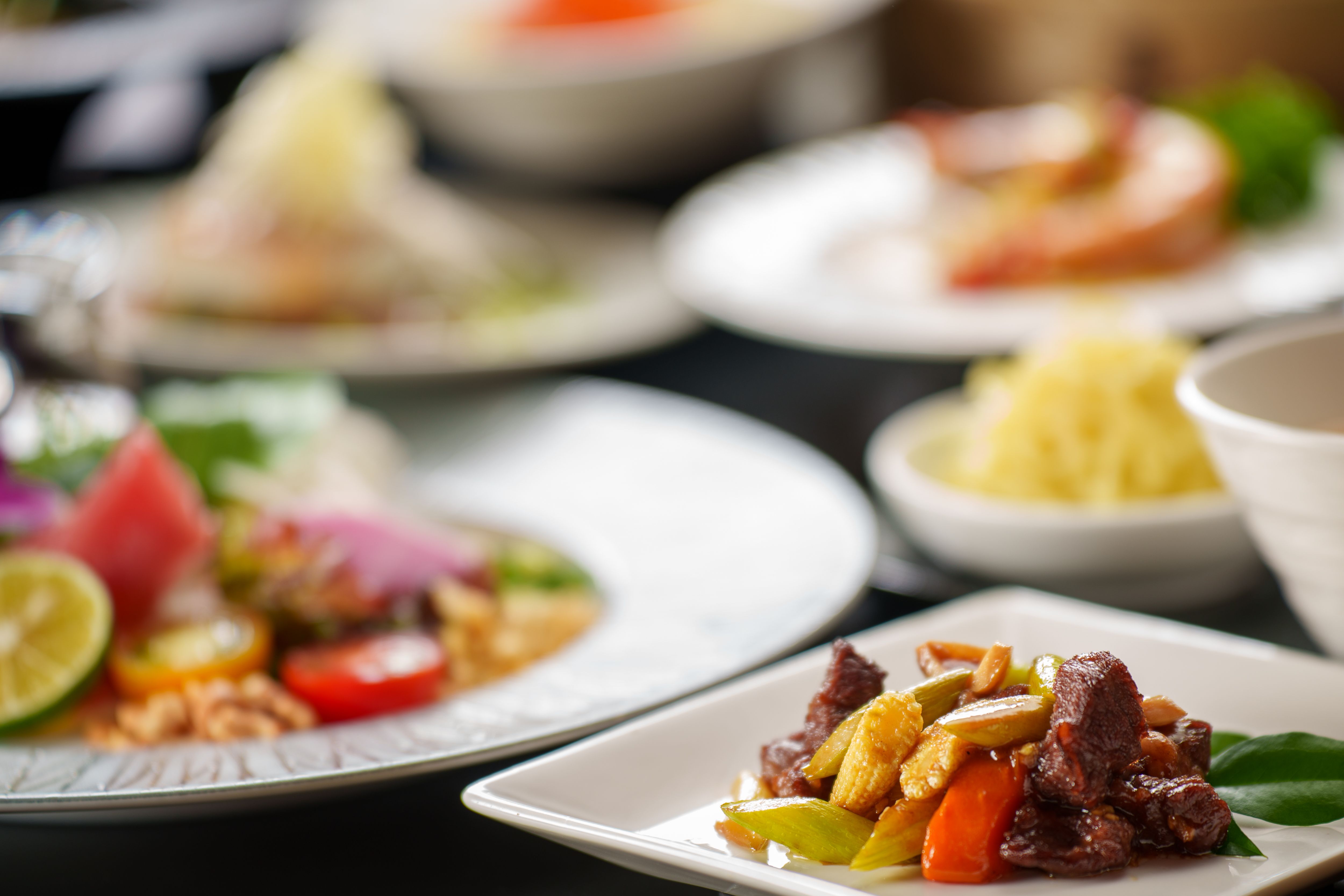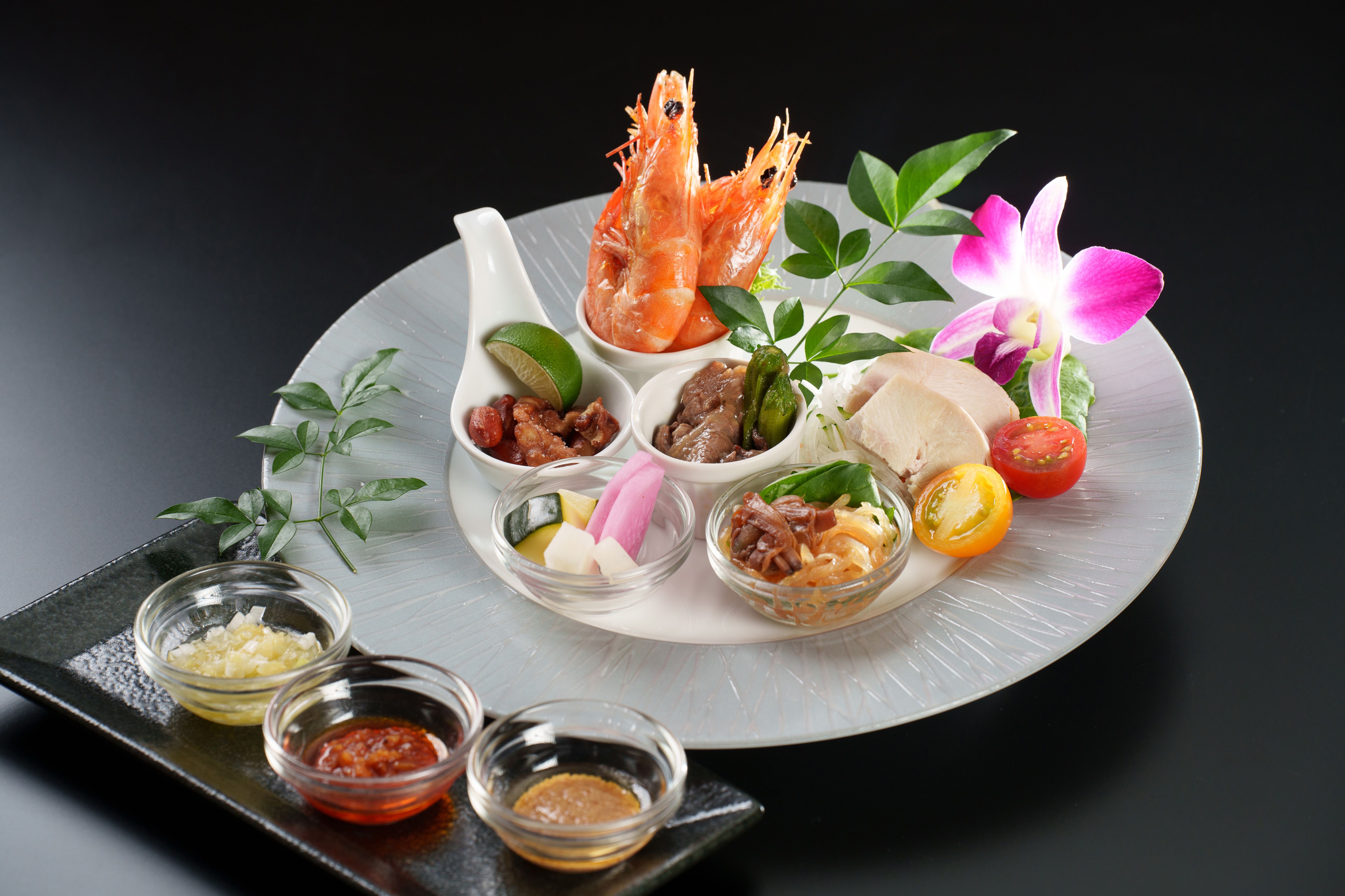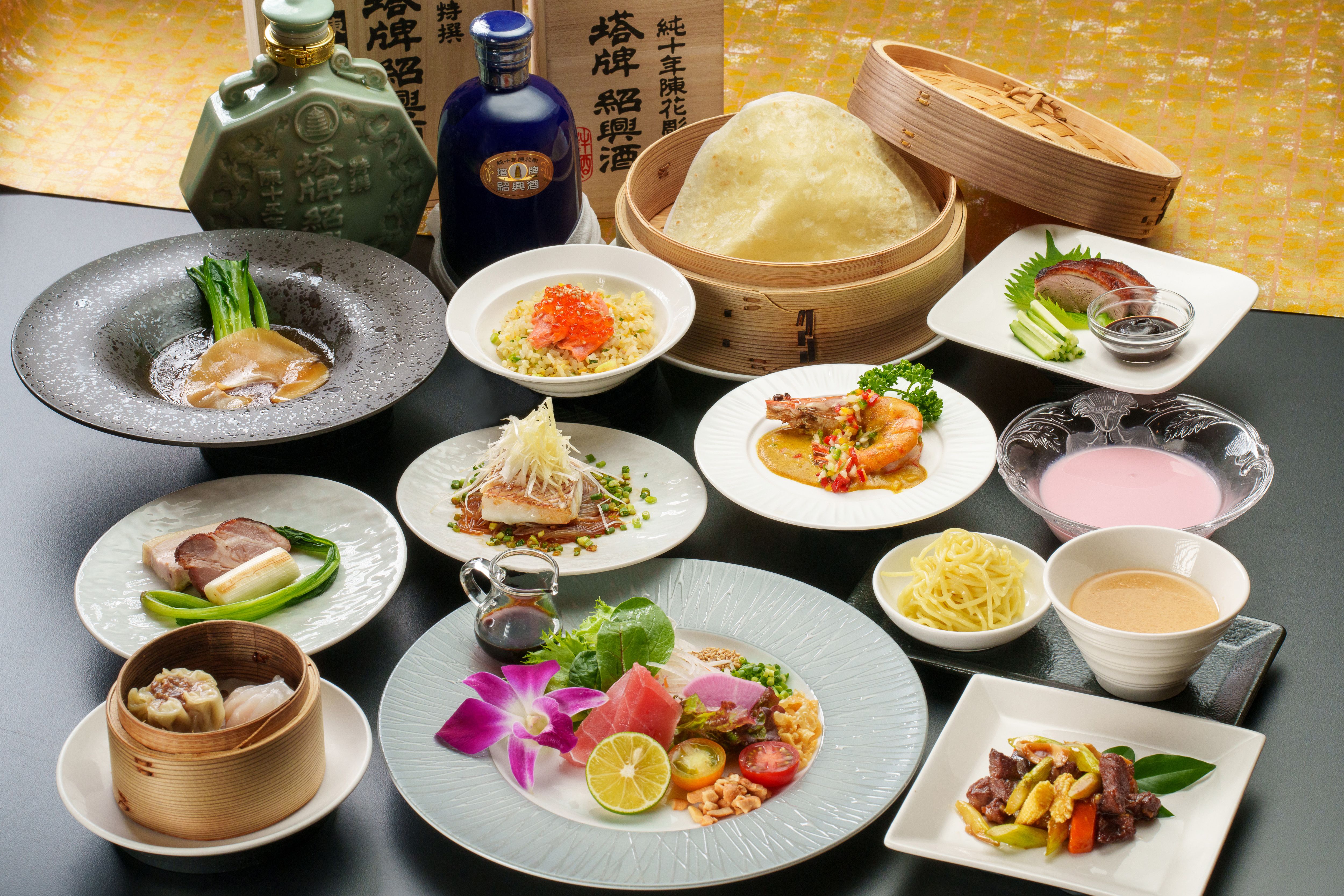 ・蒸し豚ロースのサラダ仕立て特製甘辛ソース掛け・フカヒレ入りスープ・いろいろ蒸籠蒸し八種(海鮮入り水餃子・白身魚の自家製XO醤・五目湯葉のオイスター風味・フカヒレ入り餃子・牛タン焼売・海老入り焼売・上海蟹みそ入り小籠包・国産牛と野菜の辛味醤)・鮭入りスープ炒飯・杏仁豆腐フルーツソース掛け