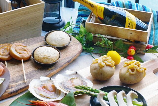 店舗は、広大な空と海からの潮風を感じながらテラスでキャンプBBQをして食事をするスタイル。漁師町の真鶴港に位置した店舗だけあって、獲れたて新鮮な魚介類を味わうことができます。蓋付きのバーベキューコンロで、家族や仲間と楽しみながら調理できるのがキャンプBBQの醍醐味です。 食材も魚介類だけでなく、サーロインステーキや厚切り牛タン、自家製塩辛じゃがバターや焼きマシュマロのチョコなどメニューも豊富。ドリンクもビールやトロピカルカクテル、ワインやノンアルコールドリンクと各種取り揃えております。