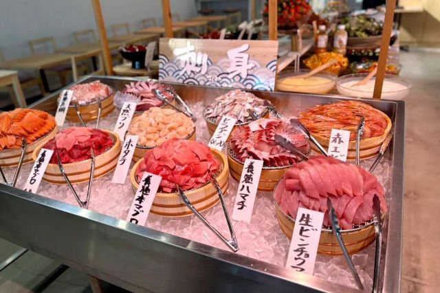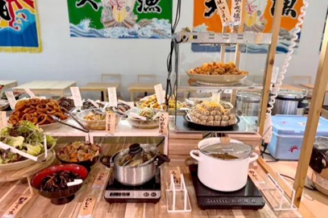川越総合卸売市場内「漁港食堂」は、新鮮な刺身や揚げ物、惣菜、デザートまで思う存分楽しめる海鮮食べ放題の食堂です。市場直送の厚切り刺身をはじめ、多彩な料理が並び、どれも素材の良さを活かしたシンプルで力強い味わい。朝の市場の活気を感じながら、家族や仲間と賑やかに海鮮を堪能できる時間をお楽しみください。