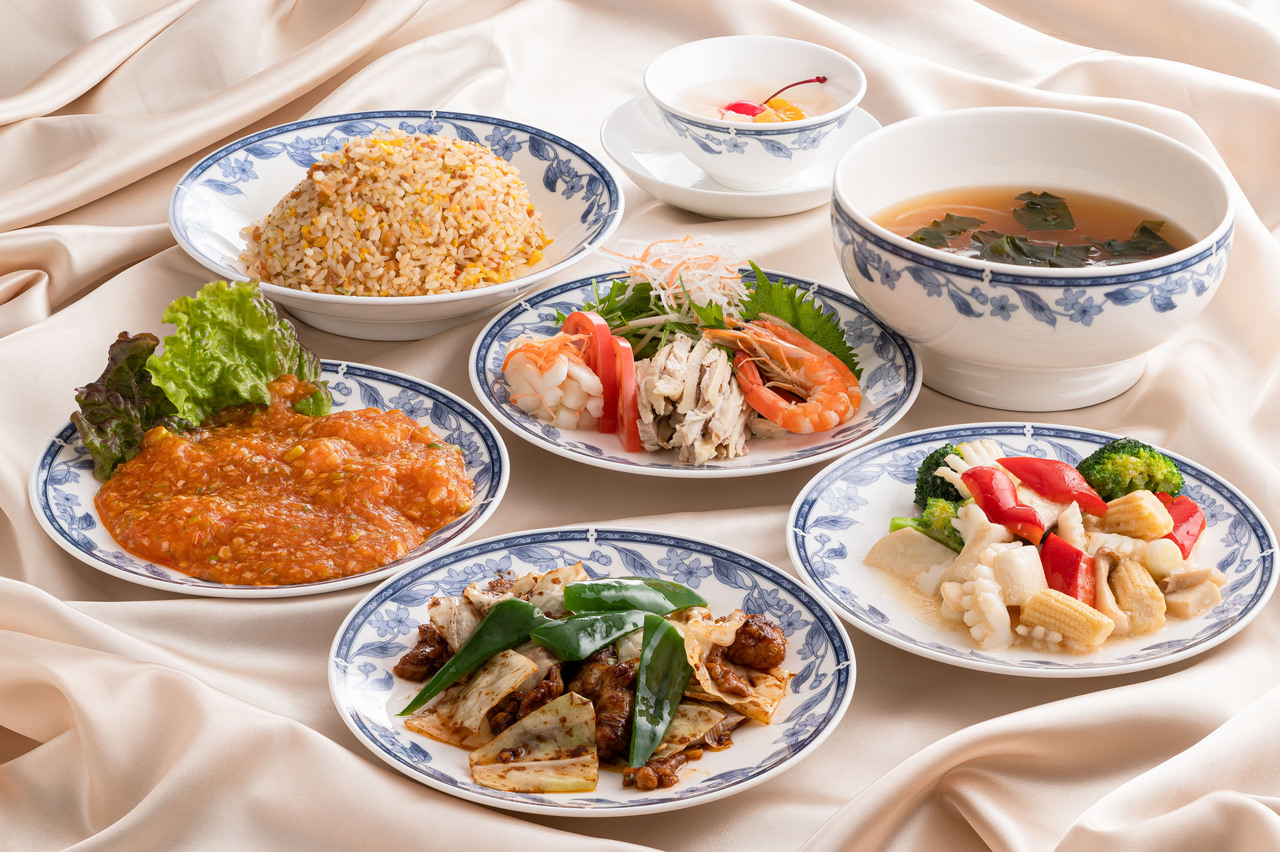 クラゲ入り前菜三種盛り合わせ、牛肉のオイスターソース炒め、テンシン三種盛り、海老のチリソース煮、マーボートーフ、カニ肉入り五目焼き飯、フカヒレスープ、お楽しみデザート、コーヒー又は紅茶