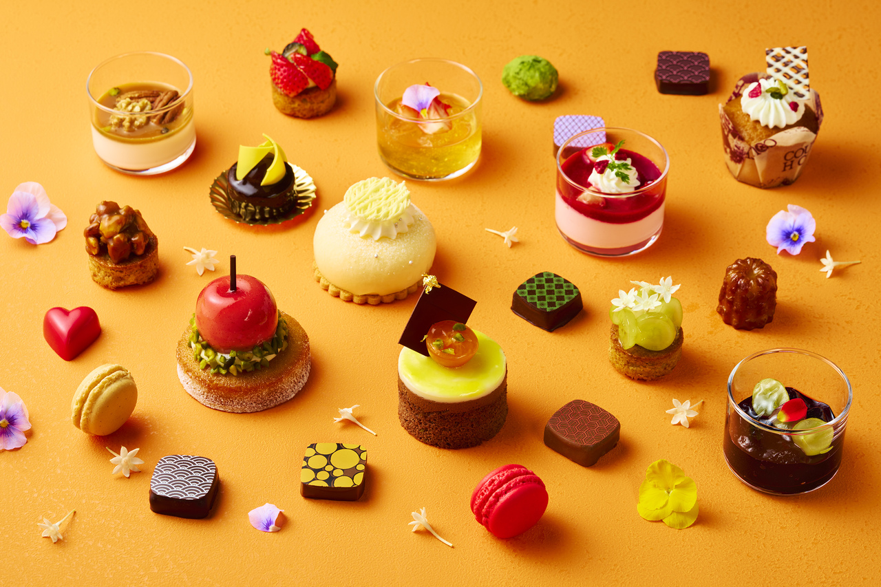 バレンタイン、アート、果実に寄ってきた小鳥が印象的な赤果実のヴェリーヌ、バレンタインの定番ハートのボンボンショコラ、アクションペインティングされたアートチョコレートムース、ひなげしのフラワーマカロン、エクレールビジュー等々、見た目も味わいもお楽しみいただけます。