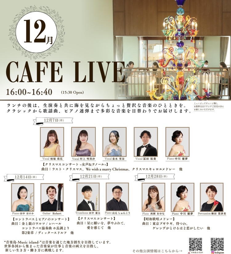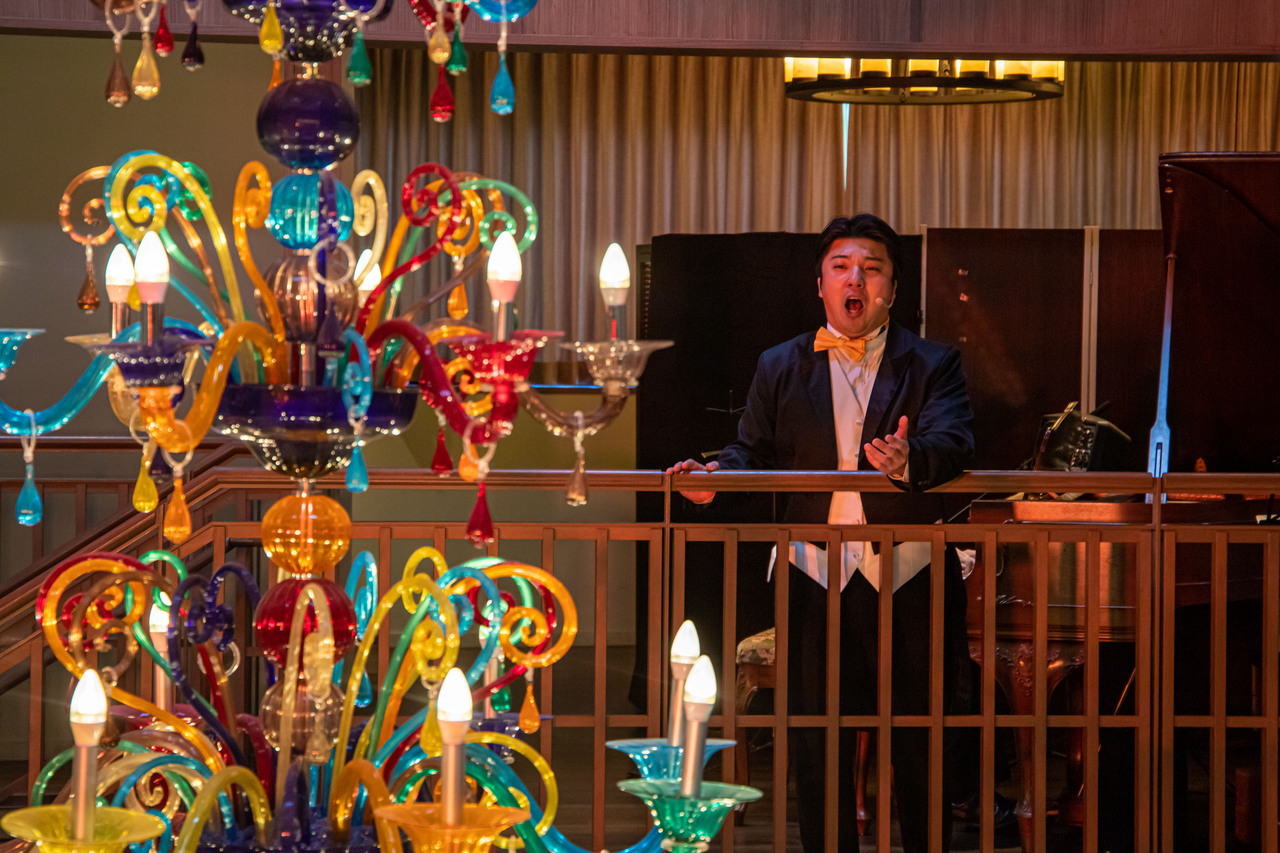 劇団四季出身の実力派俳優・坂元健児が贈る、海の舎だけの特別なクリスマスナイト。名曲の数々とともに、淡路島の恵みを贅沢に取り入れたフルコースをお楽しみいただけます。煌めくシャンデリアの下、音楽と美食が織りなす至高の一夜を―。
