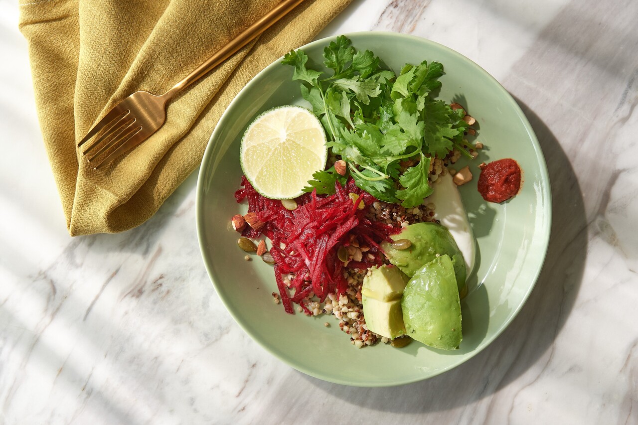 savoury grain bowl, buckwheat, beetroot, avocado and fresh herbs