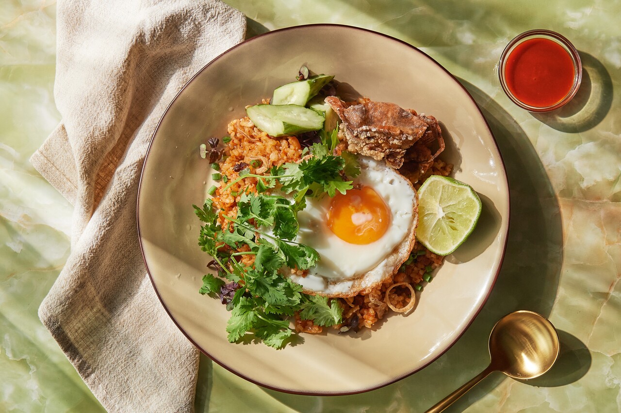 【TAKEAWAY】 ブレックファストライスボウル - フライドエッグ、 自家製'フリカケ'シーズニング、 プラムタマリンドチャツネ
