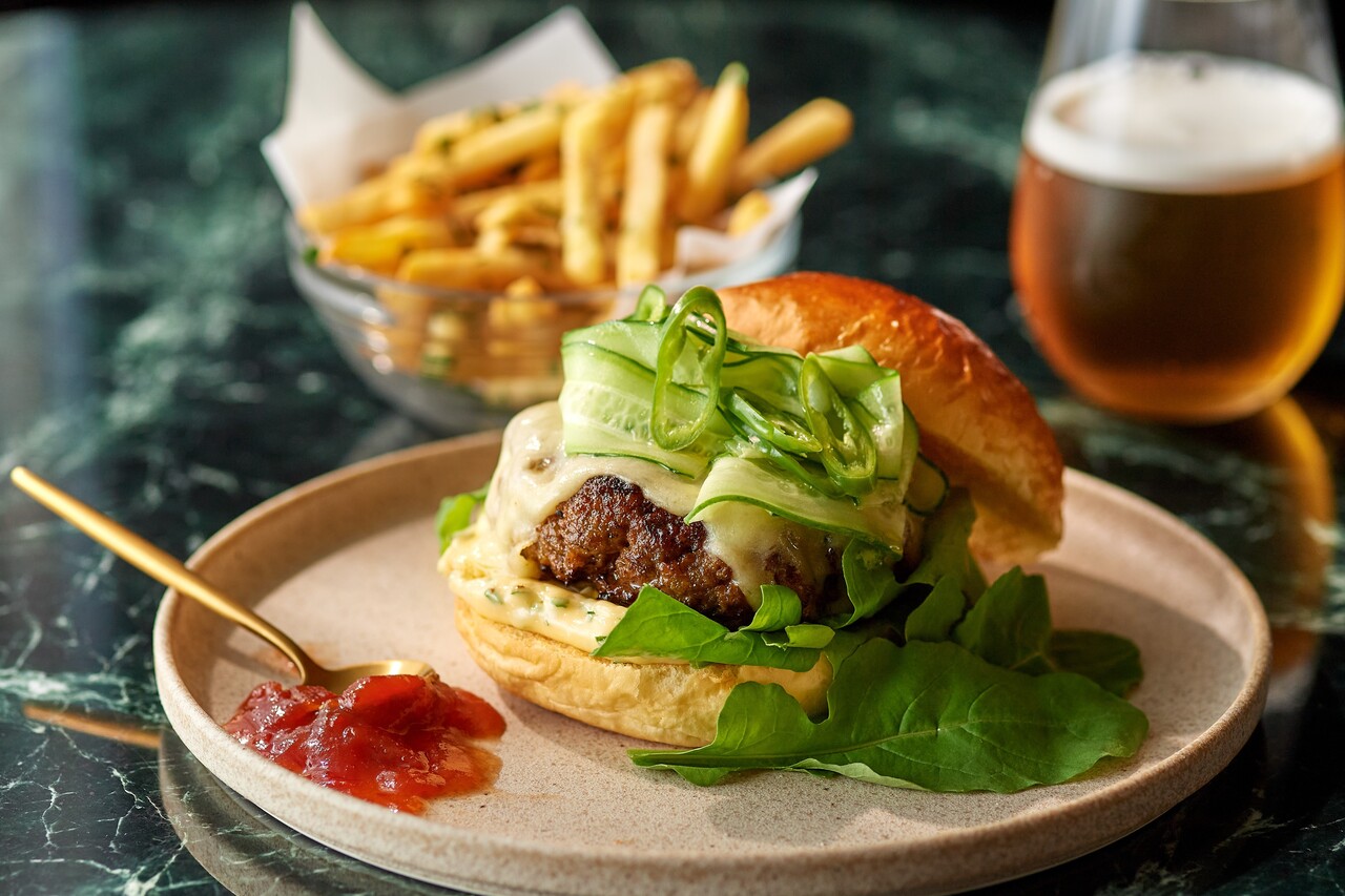 【TAKEAWAY】和牛チーズバーガー - ピクルス、グリーンチリ&ハーブマヨネーズ、トマトレリッシュ、フレンチフライ