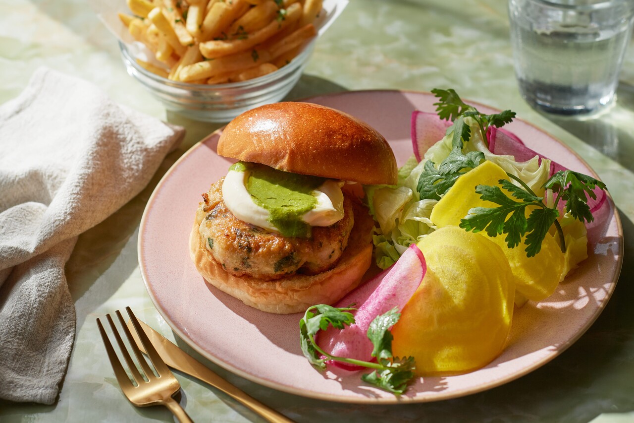 【TAKEAWAY】シュリンプバーガー - レモングラスドレッシングとアイオリ、 レタスとラディッシュのサラダ、フレンチフライ